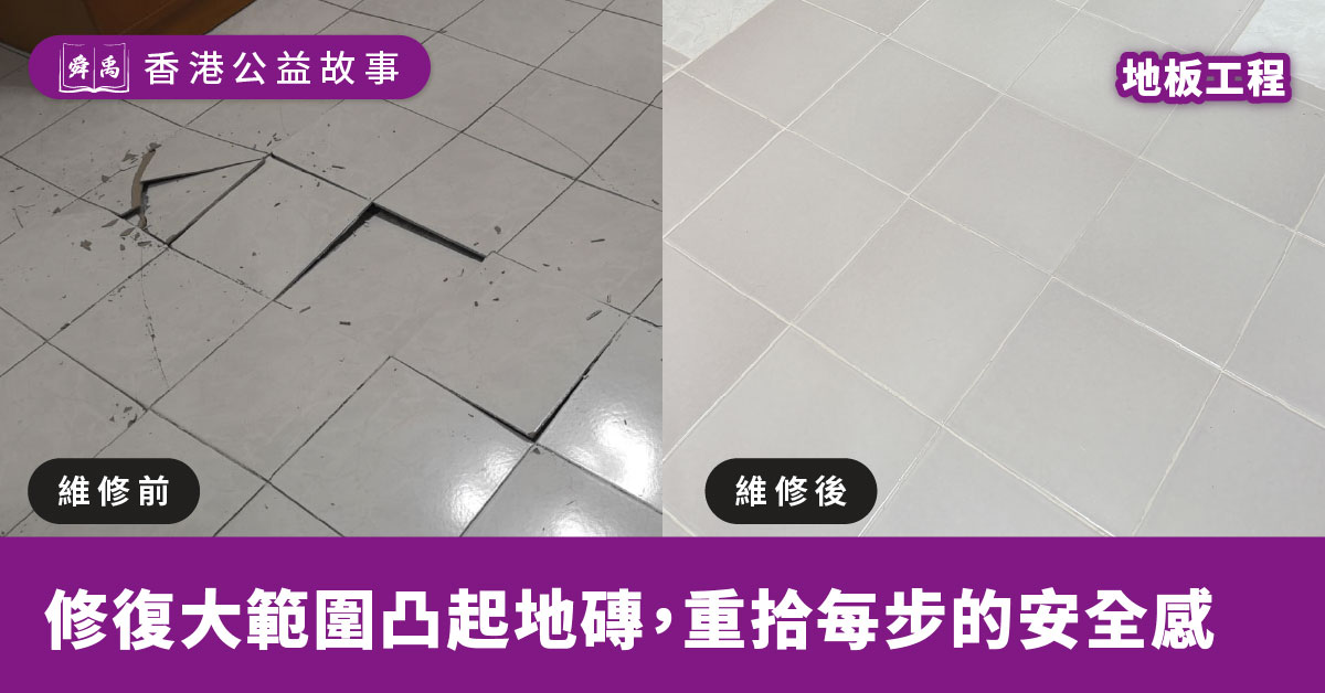 現年 71 歲的梁婆婆,婆婆平日依靠長者生活津貼維持基本開支。我們收到社工的轉介,得知梁婆婆家中的客廳出現了嚴重的安全隱患。 客廳地板出現了大範圍的瓷磚凸起,導致地面嚴重凹凸不平。這對於長者來說,是一個極高風險的「跌倒陷阱」,稍一不慎便容易被絆倒受傷。加上婆婆居住的單位屬已購入的公屋,房屋署無法介入跟進維修;而社工雖曾嘗試尋求其他資源,卻因預算不足而未能成事。求助無門的處境,令婆婆每天在家中走動都提心吊膽。